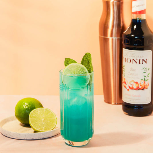Bright blue and full of zesty energy, this drink pairs lemon and ginger with the clean lift of soda and a splash of gin.