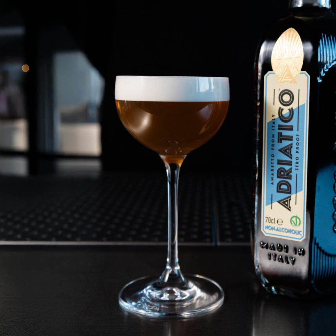 With Adriatico Zero Amaretto, a rich alcohol-free alternative, and the combination of Monin Cane Sugar, fresh lemon juice, and Fancy Foamer, this drink delivers a silky texture and a refreshing tang. The deep almond character blends effortlessly with citrus, creating a well-rounded and satisfying sip.