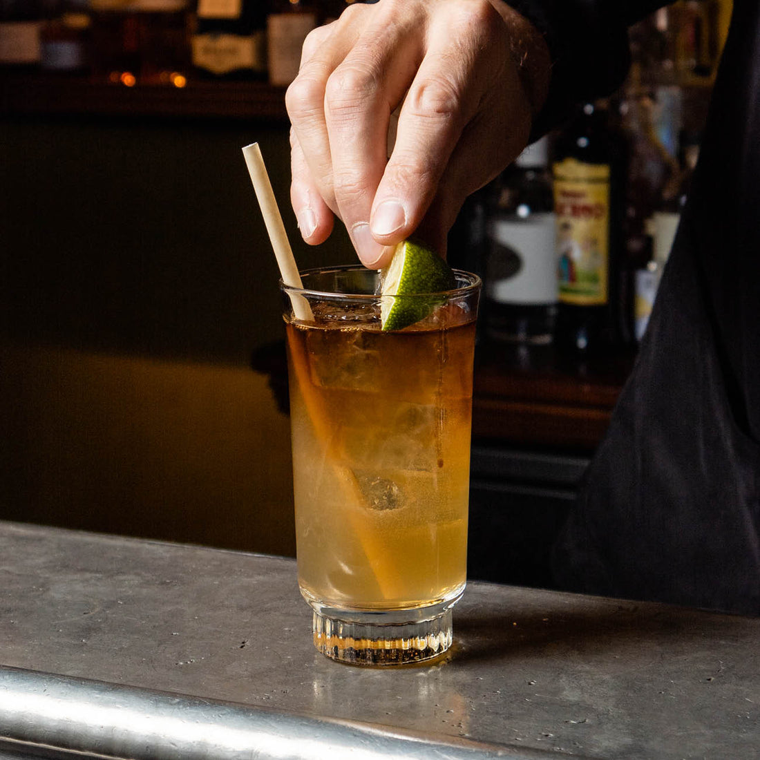 Build the cocktail with the ingredients and ice in a highball glass, here served in a Modern America Hi-ball. Add bitter and a lime wedge. Done!
