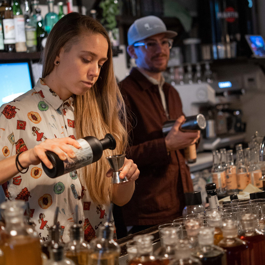 During the winter of 2021 we arranged a MUYU tasting at A bar called Gemma. With the covid situation in mind we had to keep Alex Kratena and Simone Caporale in the digital sphere on a large screen. We had the great opportunity to test the three MUYU liqueurs Chinotto Nero, Jasmine Verte and Vetiver Gris and also discussed some cocktail ideas.