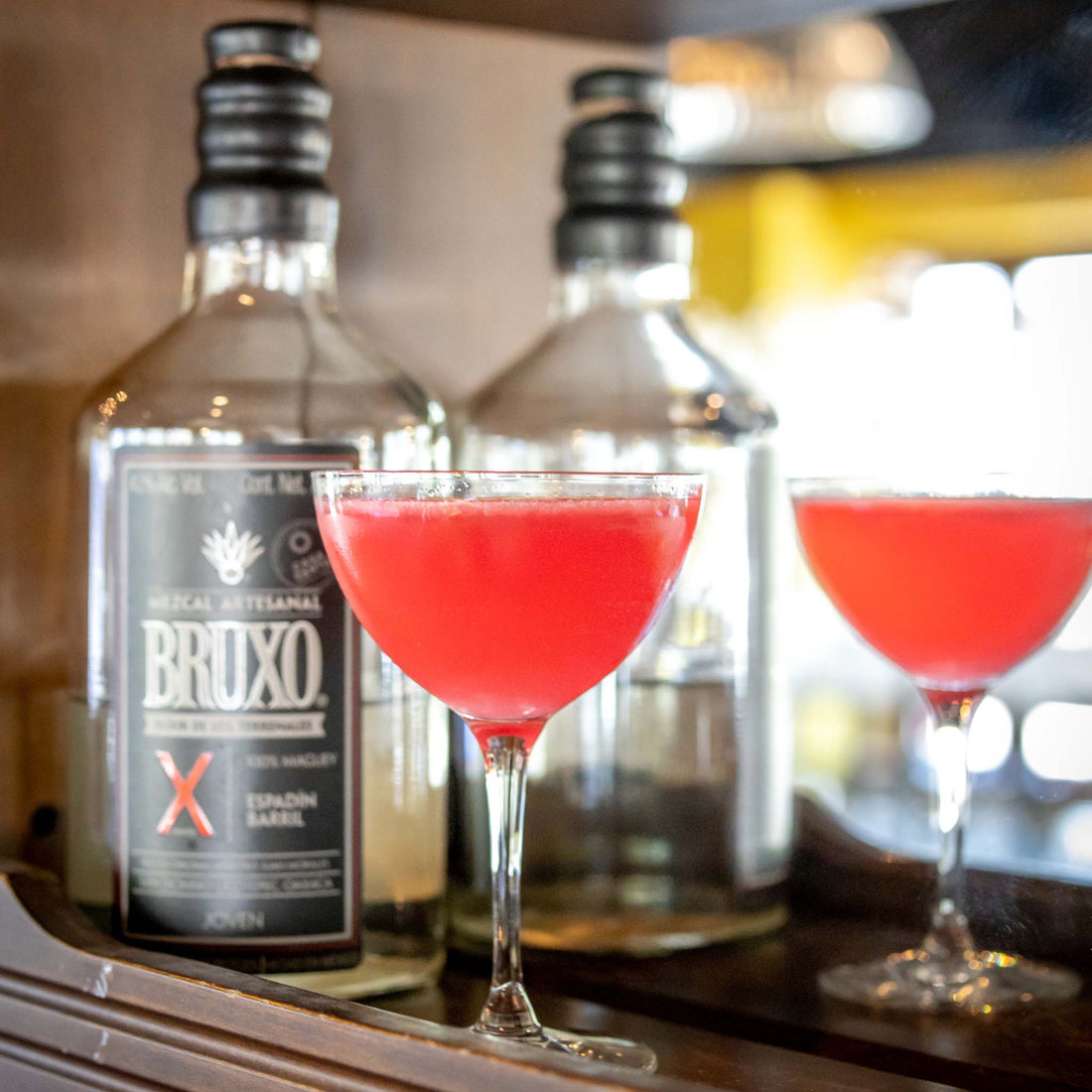 The Mezcal adds earthy and a smokey complexity to this Last Word riff with bittersweet aperitivo and freshly squeezed lime juice. Salmon pink in color served in a cocktail glass, cheers!