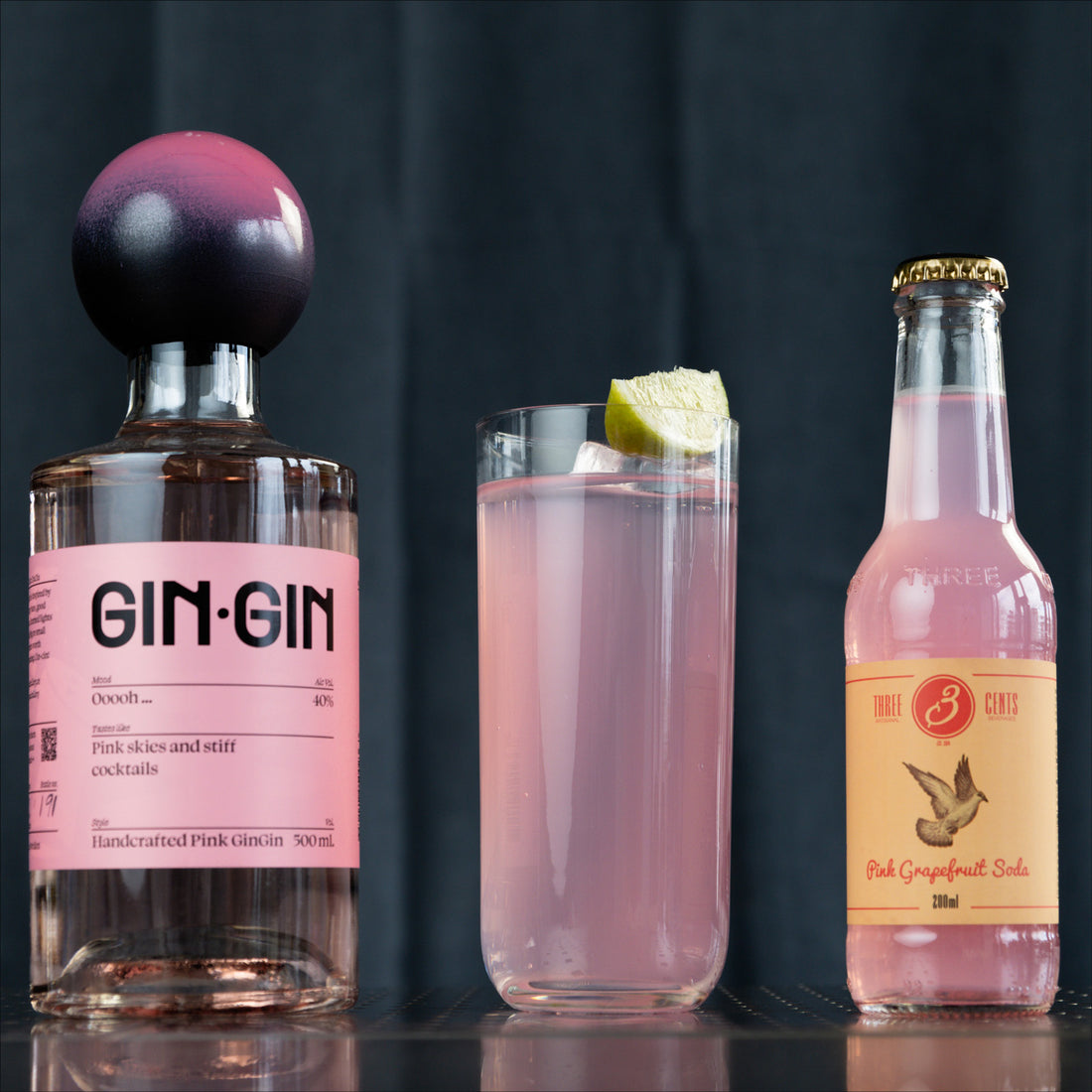Add your ingredients to a glass with a large ice cube, top up with Three Cents Pink Grapefruit soda and stir, garnish with lime and serve.