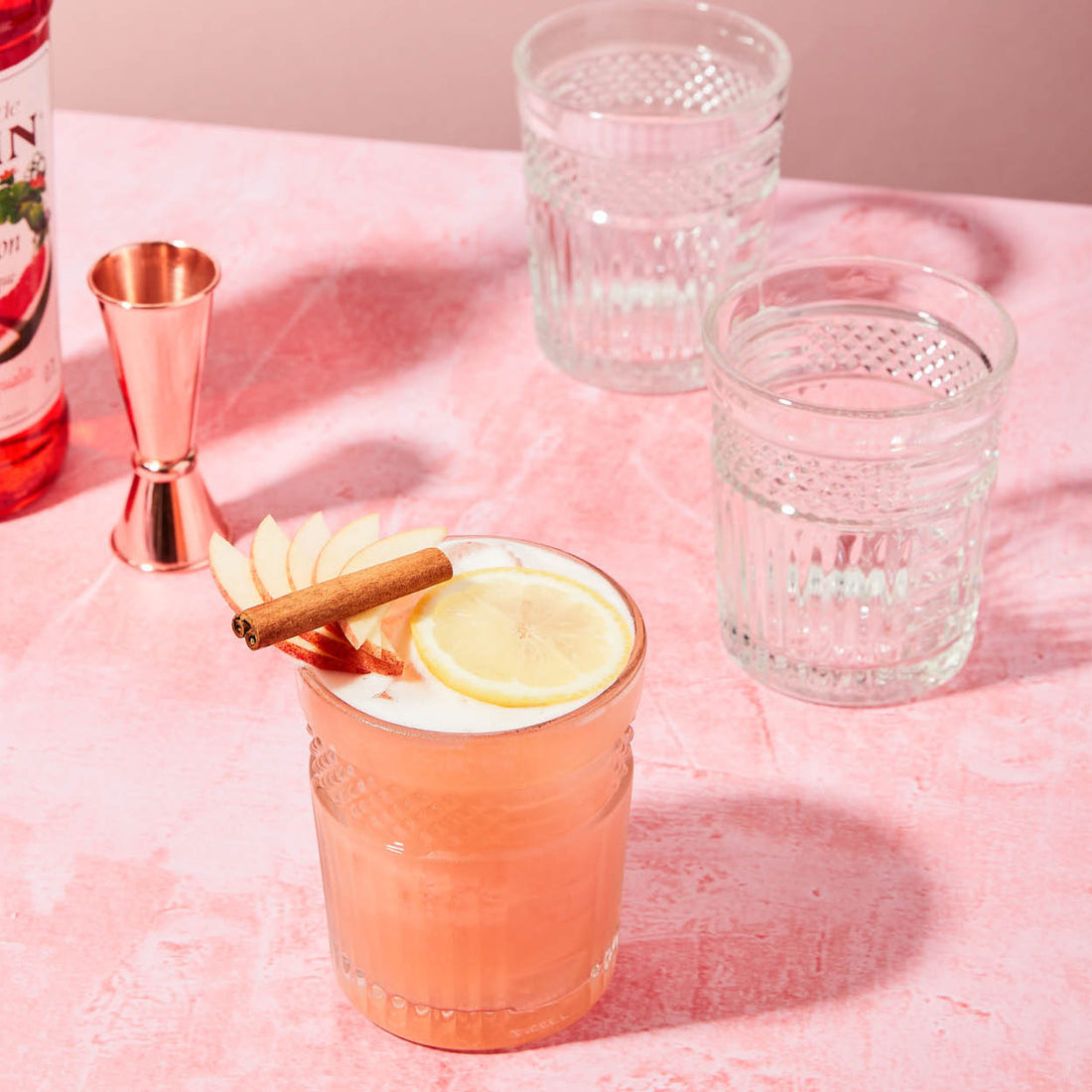 Pour the ingredients in a shaker and dry-shake. Add ice and shake again. Double strain into an old-fashioned glass filled with ice. Garnish with a lemon slice, a sliced apple and a cinnamon stick.