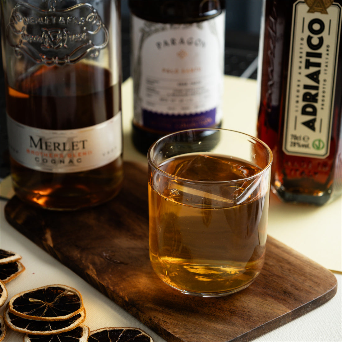 This drink combines Merlet Cognac, Adriatico Amaretto Classic, and Paragon Palo Santo, creating a harmonious mix of depth and complexity.