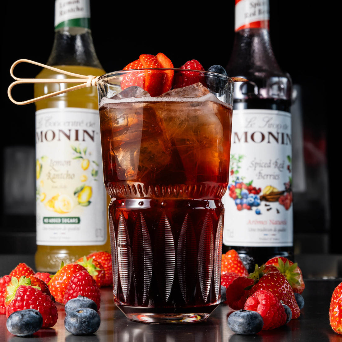 Pour all the ingredients into an ice-filled glass, stir, and garnish with fresh berries.
