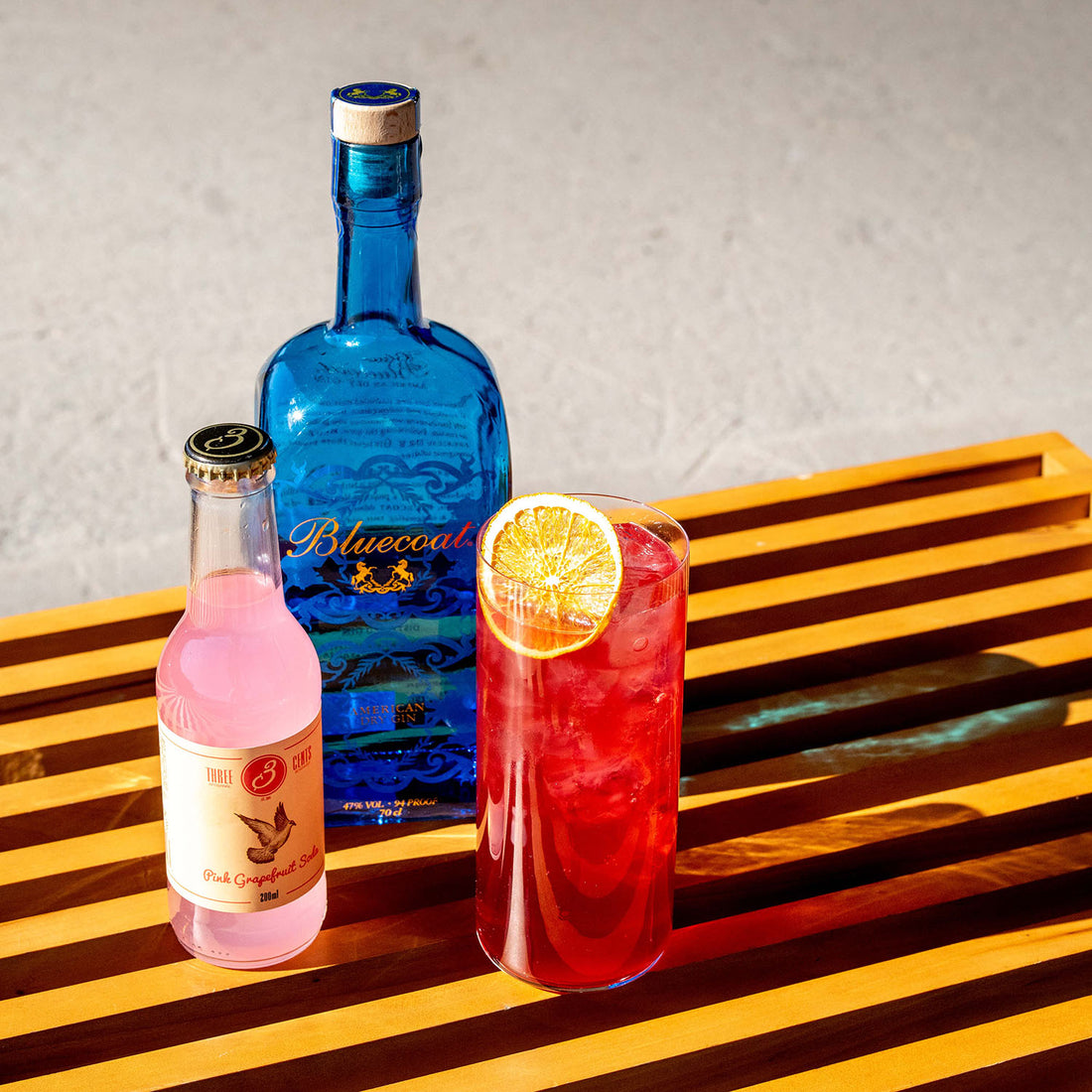 Pour the spirits together into a chilled highball glass. Top up with Three Cents Pink Grapefruit Soda and garnish.