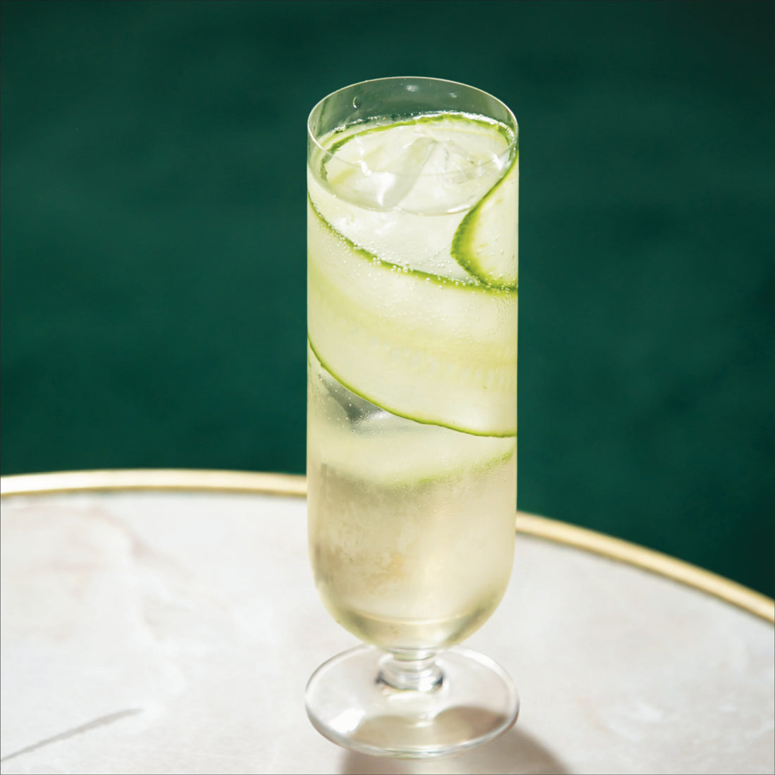 Pour all ingredients into a glass over ice cubes. Garnish with cucumber slices. Serve.
